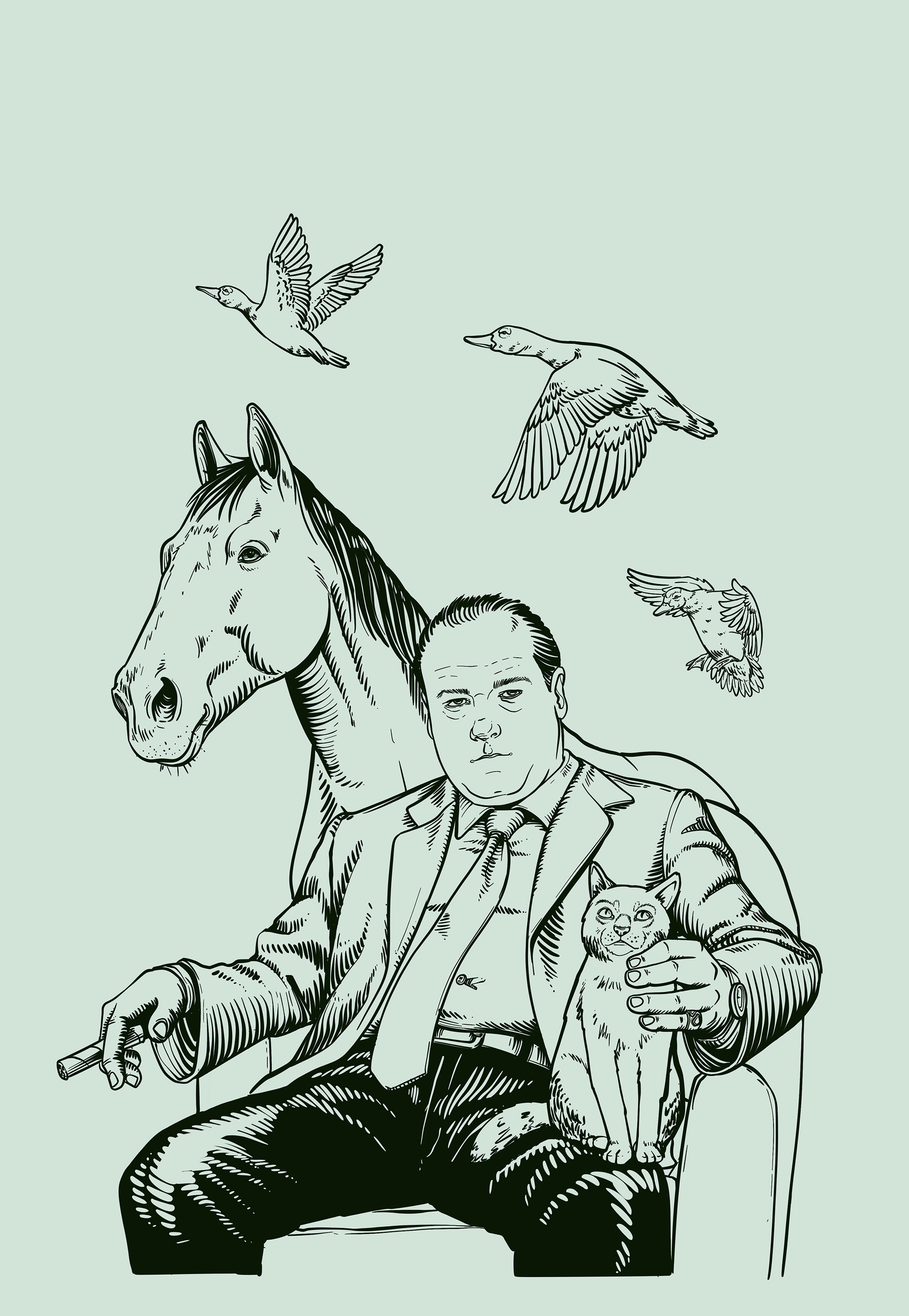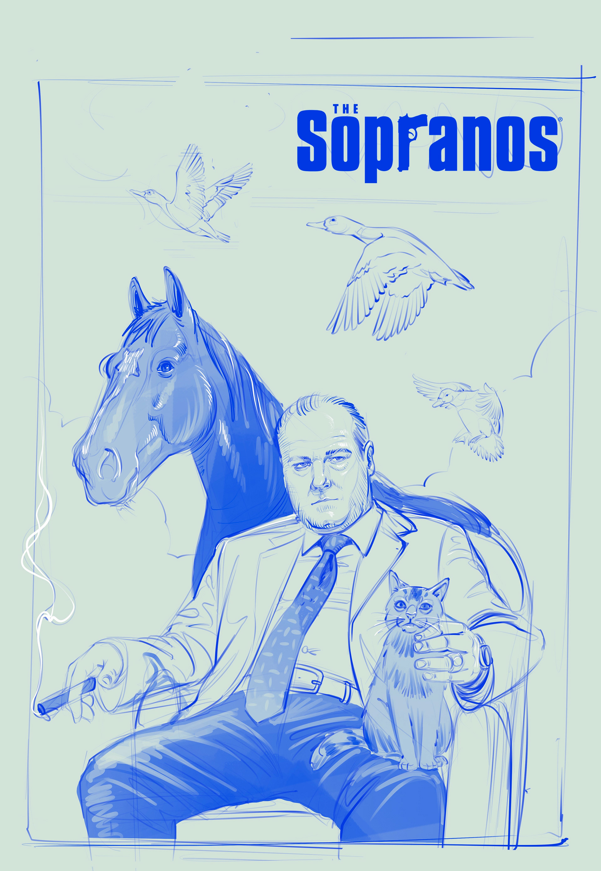 “The Sopranos” is a fan. It is a series that takes viewers into the shadows of the mafia in New Jersey, where Tony Soprano, an ambiguous leader, navigates between crime and therapy, unraveling an emotional plot delving into each character. My proposal for this poster is to represent, through visual metaphors, and delve into the complexity of Tony Soprano's mind and his internal struggles.